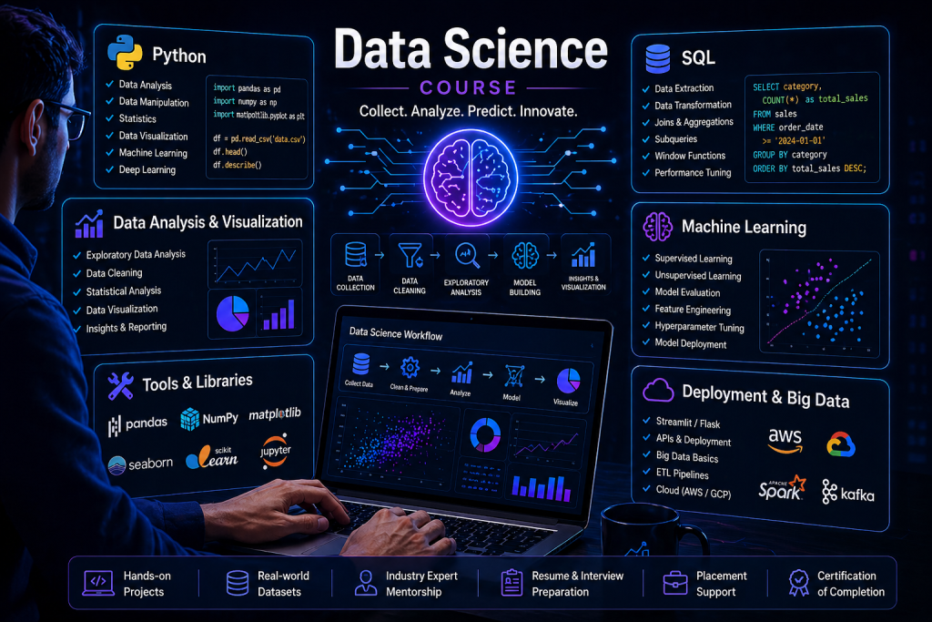 Step into the world of Data Science with AI and become a job-ready professional in one of the most in-demand fields today. This course is designed to help you build strong fundamentals in data analysis, machine learning, and real-world problem solving using modern tools and technologies.